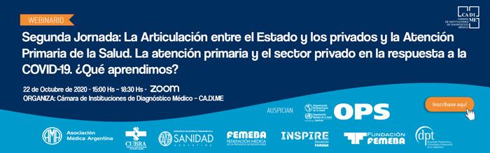 La Cámara de Instituciones de Diagnóstico Médico (CA.DI.ME) organiza la Segunda Jornada “La articulación entre el Estado y los privados y la Atención Primaria de la Salud”, que se realizará el 22 de octubre entre las 15:00 y las 18:30 hs. a través de Zoom. En dicha Jornada se abordará, como cuestión central, “La atención primaria y el sector privado en la respuesta a la COVID-19: ¿Qué aprendimos?”