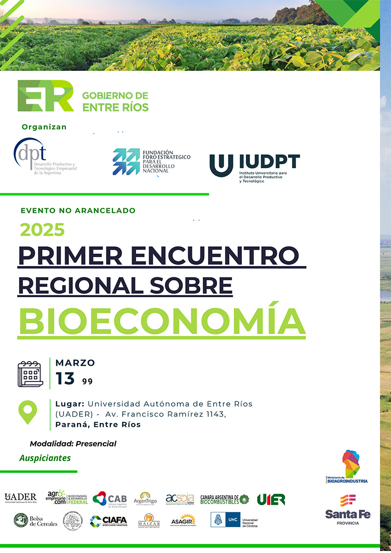 El Instituto Universitario para el Desarrollo Productivo y Tecnológico Empresarial de la Argentina (IUDPT), junto a la Fundación DPT y la Fundación Foro Estratégico para el Desarrollo Nacional, organizó el Primer Encuentro Regional sobre Bioeconomía el pasado 13 de marzo, en la sede de la Universidad Autónoma de Entre Ríos (UADER), en Paraná.